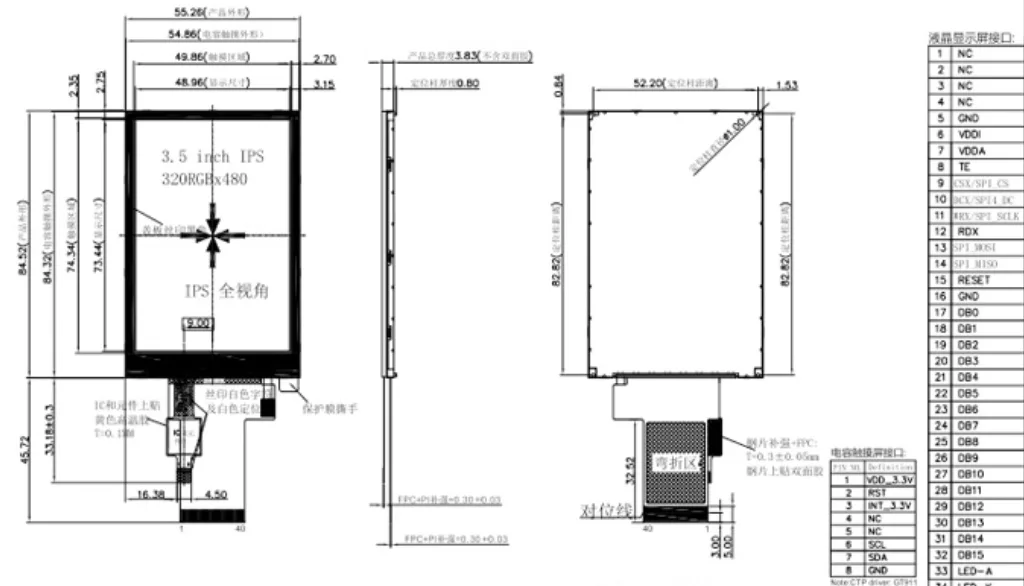 3.5 inch RGB 320x480 IPS TFT small TFT touch screen module supports a flexible MCU 8/16-bit parallel interface. Measuring 55.26 × 84.52 × 2.40 mm (excluding FPC/adhesive) and an active area of 48.96 × 73.44 mm, it fits into tight spaces. It also has an operating temperature range of -10°C to +60°C (storage temperature range of -20°C to +70°C), ensuring stable touch performance.